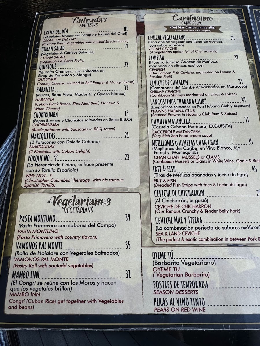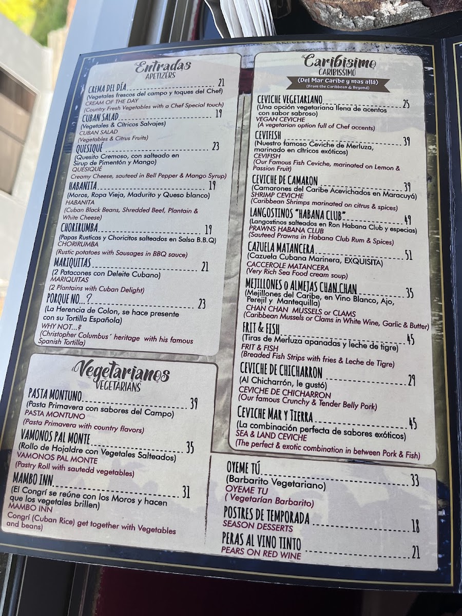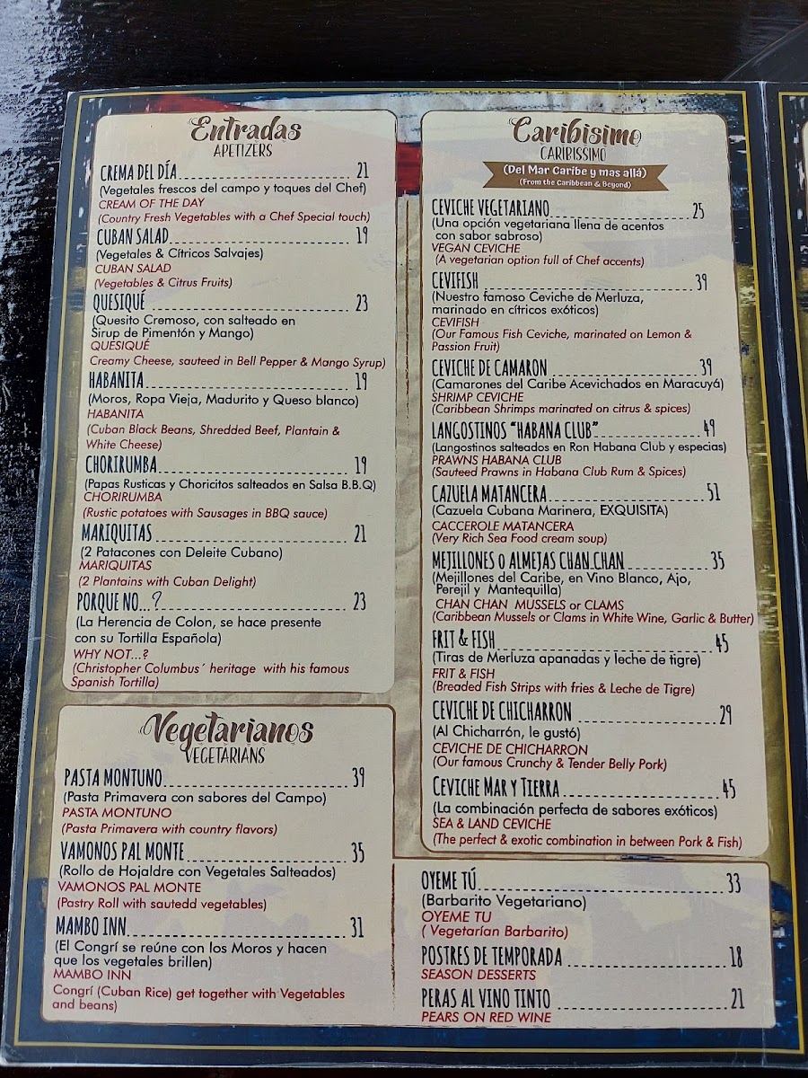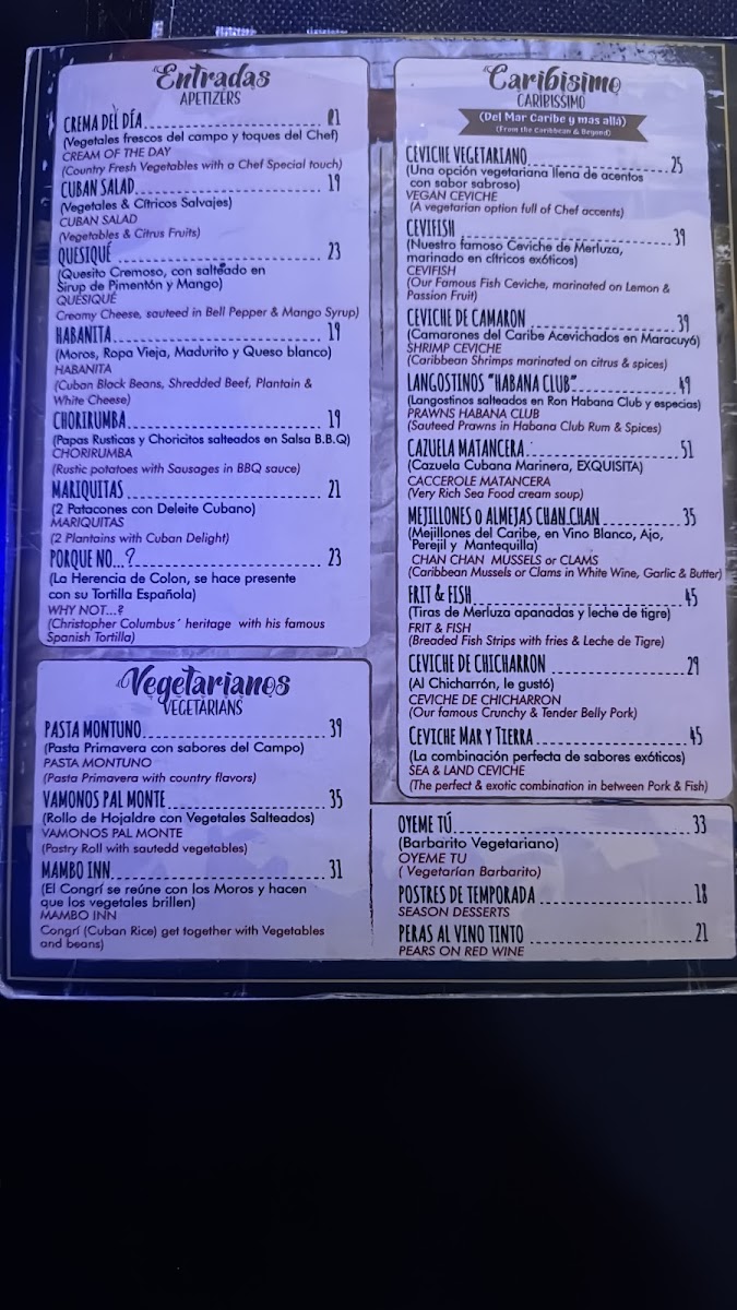 The menu is a delightful exploration of Cuban cuisine, featuring standout dishes like the Quesique Appetizer, with its tantalizing mango and cilantro sauce that perfectly complements soft cheese. The Pollo Mambo offers tender chicken bursting with flavor, beautifully presented alongside aromatic rice. For pork lovers, the Benny More shines with its perfectly seared strips, complemented by crispy potatoes.